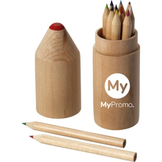 12 matite colorate in confezione cilindrica di legno a forma di matita. Decorazione non disponibile sui componenti. Legno di pioppo.