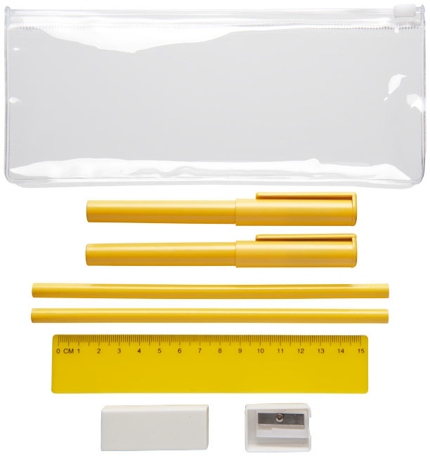 Questo set di matite è il perfetto regalo promozionale di cui hai bisogno nella tua vita professionale quotidiana. Include 2 penne a sfera (1 con inchiostro nero, l'altra con blu), 2 matite, un righello, un temperino e una gomma.