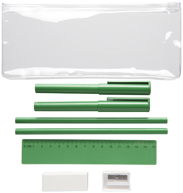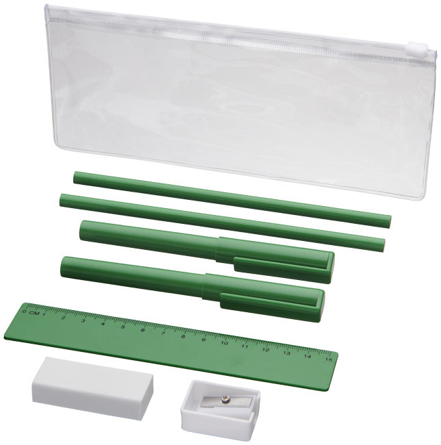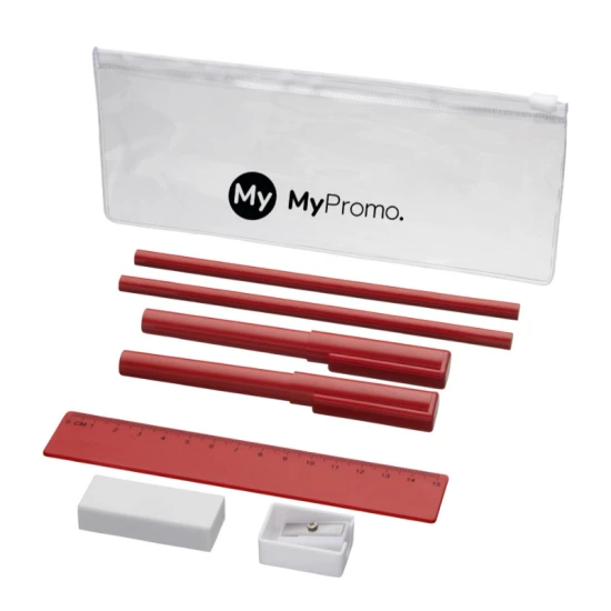 Questo set di matite è il perfetto regalo promozionale di cui hai bisogno nella tua vita professionale quotidiana. Include 2 penne a sfera (1 con inchiostro nero, l'altra con blu), 2 matite, un righello, un temperino e una gomma.
