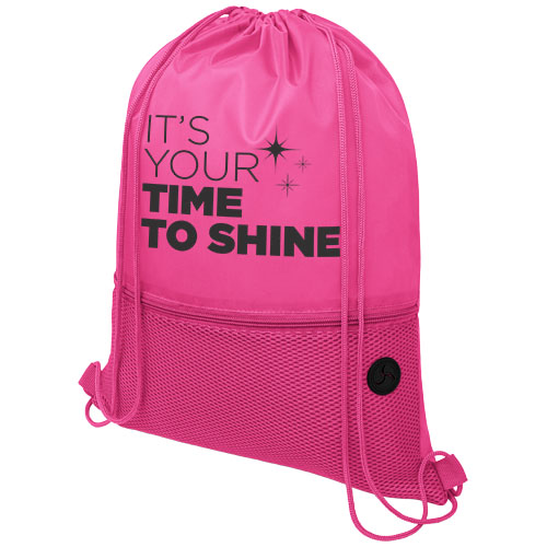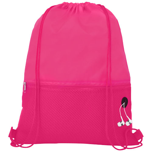 Zaino con cordoncino a scomparto principale con chiusura a coulisse in colore abbinato. Tasca anteriore in rete con cerniera e una porta per auricolari. Resistenza fino a 5 kg di peso. 210D Poliestere.