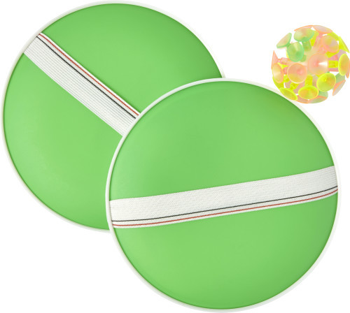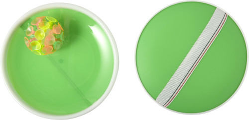 Plastic, three-piece ball game. Contains one ball with suction cups and two holders to catch it with.