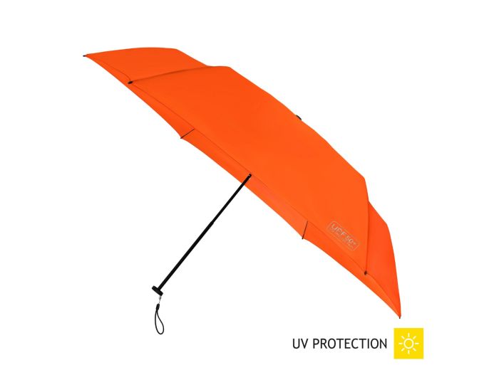 The FALCONETTI® summer umbrella you'll want to own! The UPF 50 coating blocks 98% of UVB radiation, making this umbrella an essential accessory for sunny days. The tip of the 3-section fibreglass ribs is made from high-quality fibreglass, renowned for its impressive strength and long-lasting performance, making the umbrella reliable and durable in use. The lightweight canopy is made from polyester pongee, finished with a unique UPF 50 coating that allows only 2% of UVB radiation to pass through, making it ideal protection against the sun. The umbrella is easy to open by hand: simply slide the runner upward until it clicks into place and the umbrella is ready to use. The slim, compact handle reinforces the minimalist character of this clever design. Whether for walking, city trips or summer events, this foldable umbrella is easy to take along thanks to its ultra-compact design. A unique umbrella offering protection against both rain and sun.